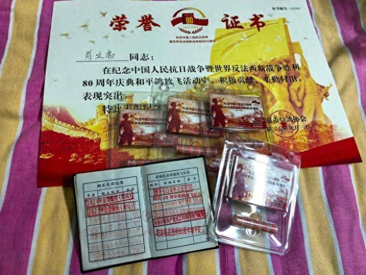 肖女士表示,此次参加和平鸽放飞活动,他们收到了信鸽协会颁发的荣誉证书,还有纪念足环。“交了多少只鸽子,就有多少个纪念足环。另外一个就是政府发放的15元补贴,相当于是鸽子的‘工资’。”