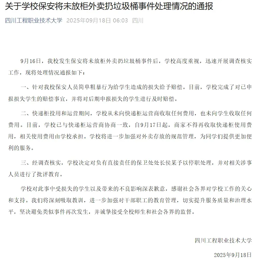 9月17日,四川工程职业技术大学保卫处工作人员告诉记者,因外卖长时间放置在室外高温环境下,存在变质风险,为保障同学们的食品安全,保安将其扔进垃圾桶,学校需为大家的健康负责。