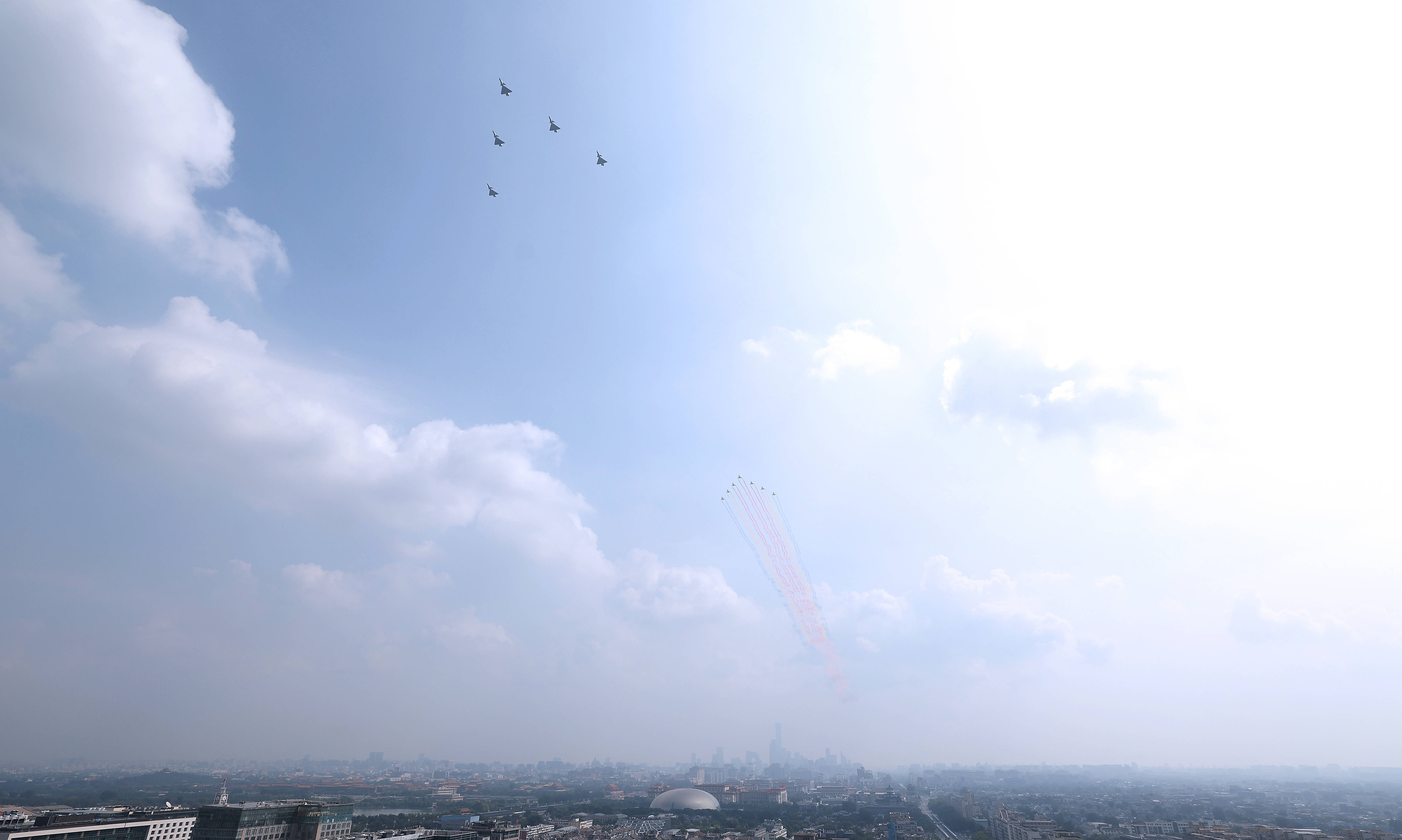 这是空中护旗梯队飞过天安门广场上空。新华社记者 李响 摄记者感言:80年前的烽火硝烟中,抗战先辈以热血铸就不朽功勋;80年后的和平盛世里,我们用阅兵铭记历史、缅怀先烈。