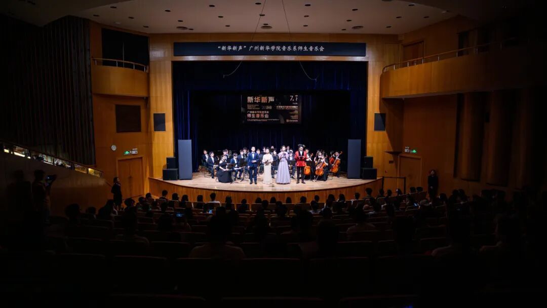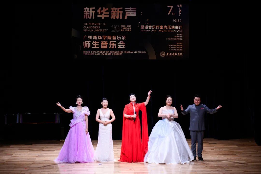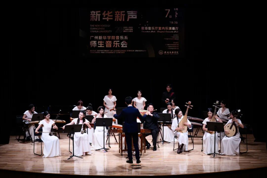 本场音乐会不仅是艺术的呈现,更是广州新华学院音乐系“三台协同”育人理念的生动实践。在刘婉莉(霖霖)副校长统筹指导下,音乐系纪俊娟主任、郝大微书记带领师生通力协作,确保演出高质量完成。教师与学生同台献艺,通过民歌、花腔、重奏、合唱等多种形式,展现“从讲台到舞台”的深度融合。管弦乐团、民乐团、合唱团三大学生团体表现亮眼,充分体现教学相长、实践育人的丰硕成果。
